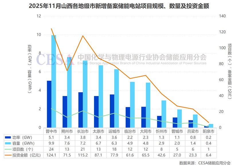 從地級市分布來看,2025年11月,晉中市新增儲能備案項目最多,達24個,總規(guī)模5.1GW/9.9GWh,占比18.7%(功率)/18.3%(容量)。