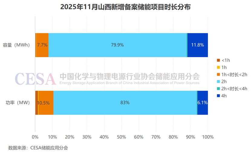 據(jù)CESA儲能應(yīng)用分會產(chǎn)業(yè)數(shù)據(jù)庫不完全統(tǒng)計,2025年11月,山西新增備案時長明確的儲能電站項目26.1GW/54.2GWh,其中2小時以下的儲能項目總規(guī)模2.8GW/4.16GWh,占比10.5%(功率)/7.7%(容量),均為“鋰電+飛輪”或“鋰電+超容”混合儲能項目。