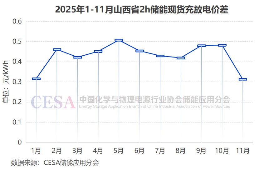 其次是現(xiàn)貨套利。2025年以來,山西現(xiàn)貨充放電價差居全國前列,2025年1-11月2h儲能現(xiàn)貨價差均價達0.43元/kWh,2小時系統(tǒng)日均充放電次數(shù)為1.45次。據(jù)行業(yè)測算,山西100MW/200MWh儲能項目現(xiàn)貨套利理論年收益超1600萬元/年。