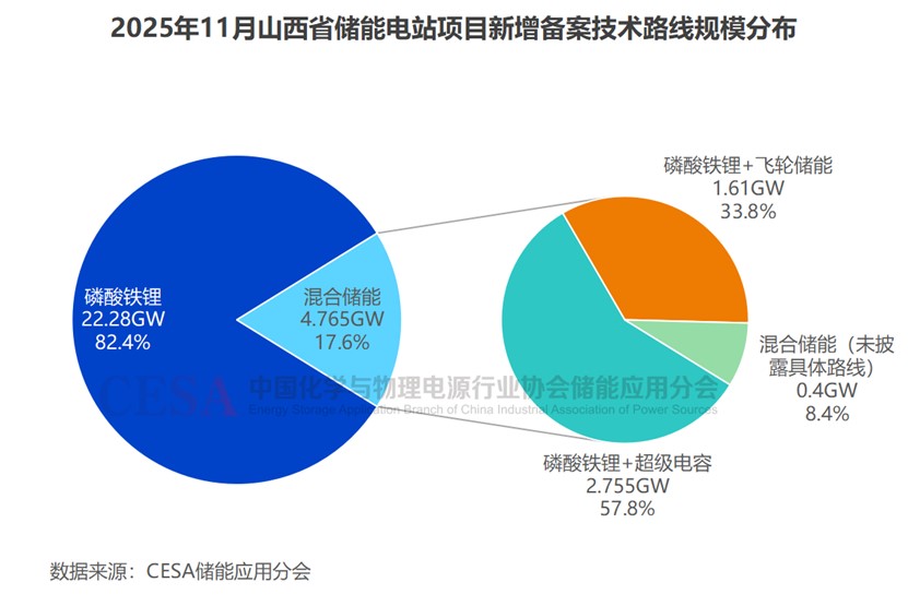 與此同時,混合儲能開始明顯加速。11月,山西省新增備案了28個混合儲能電站項目,規(guī)模高達4.8GW/7.6GWh,占全省新增備案總規(guī)模的17.6%(功率)/13.9%(容量),超過11月全國混合儲能電站新增備案總規(guī)模的50%。