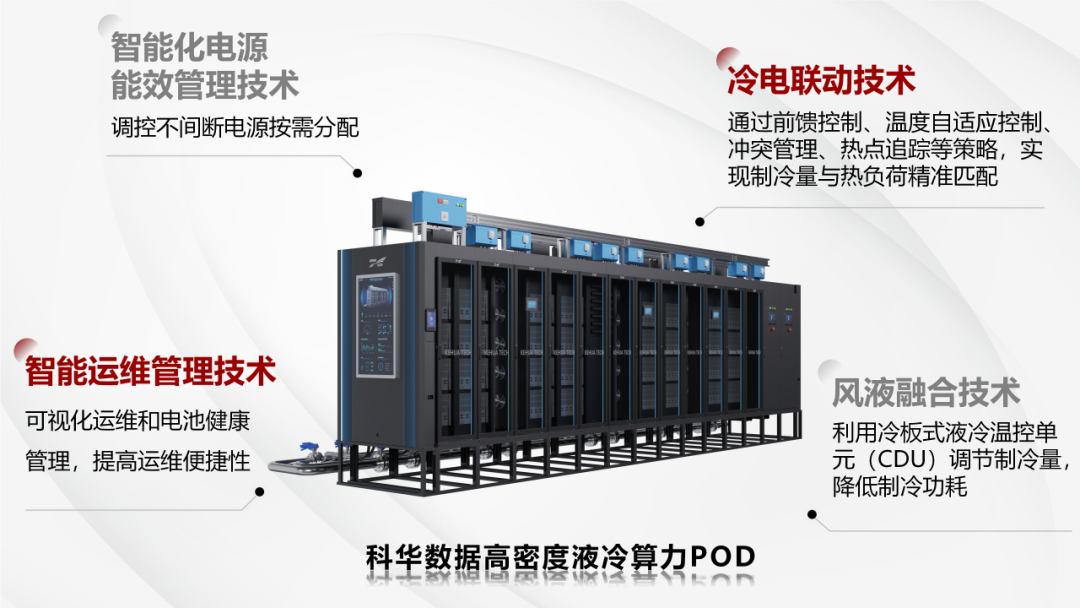 該技術(shù)已成功應(yīng)用于科華數(shù)據(jù)高密度液冷算力POD。該產(chǎn)品深度融合“AI能源智控+GPU服務(wù)器算效與資產(chǎn)智管+冷板式液冷散熱+大容量彈性配電”等新型算力基礎(chǔ)設(shè)施方案架構(gòu),可兼容適配8至128臺算力設(shè)備節(jié)點(diǎn)靈活擴(kuò)展,實(shí)現(xiàn)算力資源的智能調(diào)度與彈性部署。