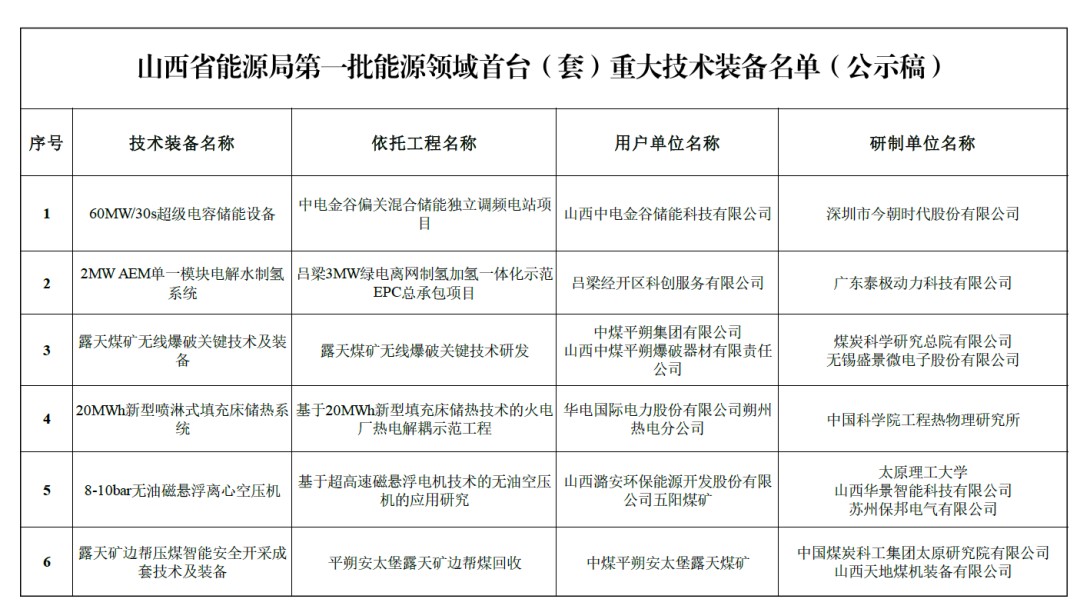中國儲能網(wǎng)訊:山西省能源局發(fā)布關(guān)于公示第一批能源領(lǐng)域首臺(套)重大技術(shù)裝備的通知,擬將11項技術(shù)裝備列入山西省能源局第一批能源領(lǐng)域首臺(套)重大技術(shù)裝備名單。