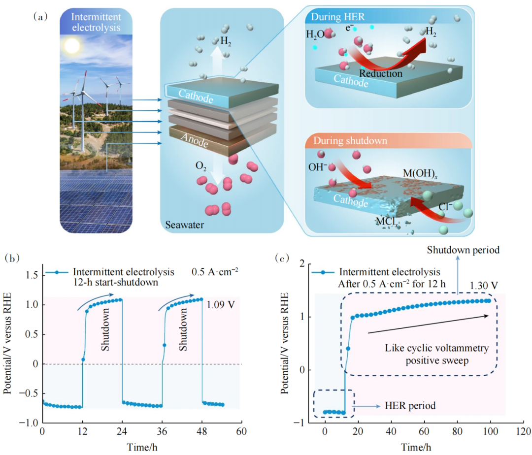 北京化工大學(xué)孫曉明團隊在Nature中的研究指出,波動性可再生能源驅(qū)動的海水電解中陰極氧化腐蝕問題,如圖3所示。