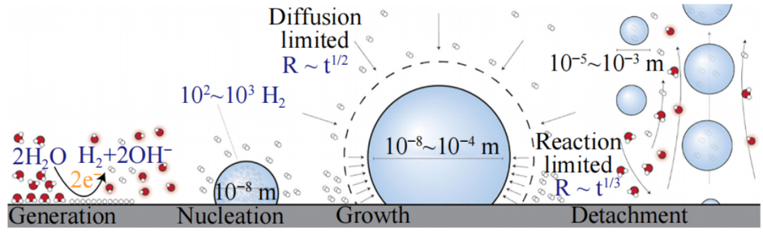 美國俄勒岡大學(xué)化學(xué)與生物化學(xué)系Paul A.Kempler團隊在Chemical Reviews中的研究指出,電解水過程中析氫反應(yīng)和析氧反應(yīng)產(chǎn)生的氣泡會影響制氫的能量轉(zhuǎn)換效率。其工作也概述了氣泡生命周期中發(fā)生的物理過程,如圖4所示。