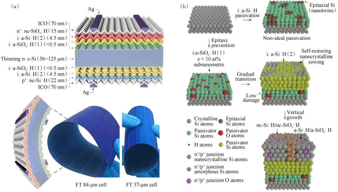 江蘇科技大學(xué)李陽團隊在Nature中的研究指出為避免外延,采用低損傷連續(xù)等離子體化學(xué)氣相沉積策略,成功制造出不同厚度(55~130 μm)的高性能電池。以“超薄、柔性”晶硅異質(zhì)結(jié)太陽能電池的優(yōu)勢,其結(jié)構(gòu)與工藝示意如圖7所示,使得用于旅行的彎曲或卷起晶體硅太陽能電池指日可待。