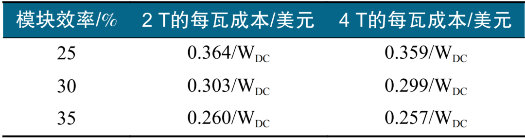 現(xiàn)階段,對能源的需求量大幅增大,導(dǎo)致硅太陽能電池板使用量猛增,必須要將報廢的硅太陽能電池板合理地回收處理,減少對生態(tài)系統(tǒng)的負(fù)面影響,確保資源的長期可利用性。武漢大學(xué)尹華意團隊在Nature Sustainability中的研究指出一種簡單的鹽蝕刻方法,僅需180 s就可以從報廢的硅太陽能電池板中回收銀和硅,且未使用無機酸等有毒試劑,更不會有二次污染產(chǎn)生。同時,硅太陽能電池板中的錫、鋁、銅和鉛也能被氧化、堿浸和電沉積相結(jié)合的方法進行處理。美國國家可再生能源實驗室研究人員在Joule中指出了成本敏感性分析,提高組件效率是降低成本的最高效途徑。在此,其團隊提供了鈣鈦礦/硅串聯(lián)(PST)光伏模塊4 T和2 T設(shè)計的成本模型,如表1所示。