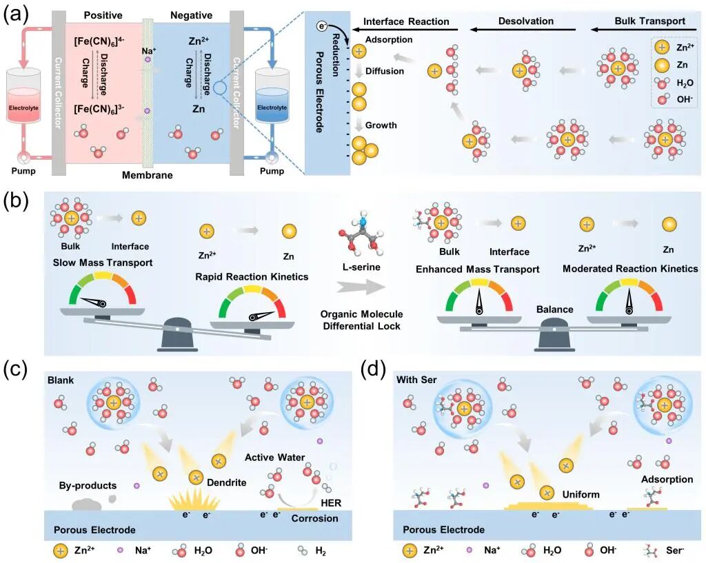 針對(duì)上述挑戰(zhàn),西安交通大學(xué)能動(dòng)學(xué)院何雅玲院士、李印實(shí)教授科研團(tuán)隊(duì)創(chuàng)新性地提出了“有機(jī)分子差速鎖”的概念,報(bào)道了一種利用L-絲氨酸(Ser)添加劑來(lái)構(gòu)建有機(jī)分子差速鎖的策略。其核心設(shè)計(jì)理念在于將Ser作為多功能添加劑部署到負(fù)極電解液中,通過(guò)體相和界面的分區(qū)調(diào)控建立一個(gè)鋅離子傳輸和電化學(xué)反應(yīng)平衡的有利化學(xué)環(huán)境,從而實(shí)現(xiàn)堿性鋅基液流電池的長(zhǎng)時(shí)穩(wěn)定循環(huán)。
