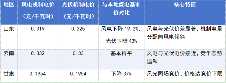 云南新能源消納條件相對(duì)較好,新能源電價(jià)能夠維持在較高水平。甘肅采用風(fēng)電、光伏同場(chǎng)競(jìng)價(jià)的市場(chǎng)結(jié)構(gòu),競(jìng)爭(zhēng)機(jī)制直接推動(dòng)價(jià)格下行至競(jìng)價(jià)下限,反映出區(qū)域市場(chǎng)結(jié)構(gòu)對(duì)新能源電價(jià)的直接導(dǎo)向作用。