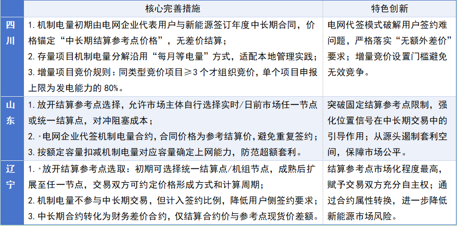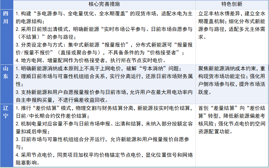 136號(hào)文的核心任務(wù)之二,在于通過“完善現(xiàn)貨市場(chǎng)交易和價(jià)格機(jī)制”“健全中長(zhǎng)期市場(chǎng)交易和價(jià)格機(jī)制”,推動(dòng)新能源上網(wǎng)電價(jià)全面由市場(chǎng)形成。各地承接方案同步協(xié)同,其中,山東、四川和遼寧具備典型性。
