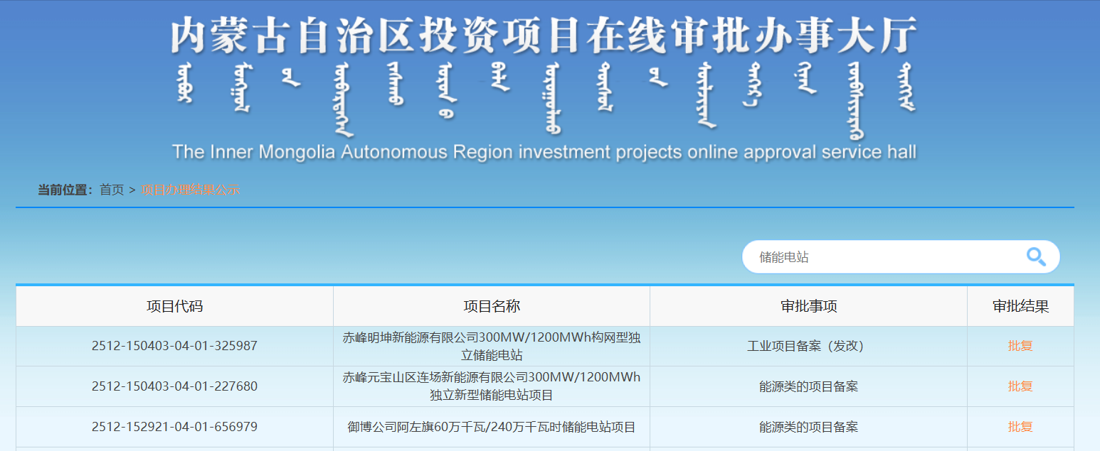 中國儲能網(wǎng)訊:據(jù)內(nèi)蒙古自治區(qū)投資項目在線審批辦事大廳相關信息顯示,近日內(nèi)蒙古共有3個大型儲能項目備案獲批,總投資40.8億元,總儲能規(guī)模達1.2GW/4.8GWh。