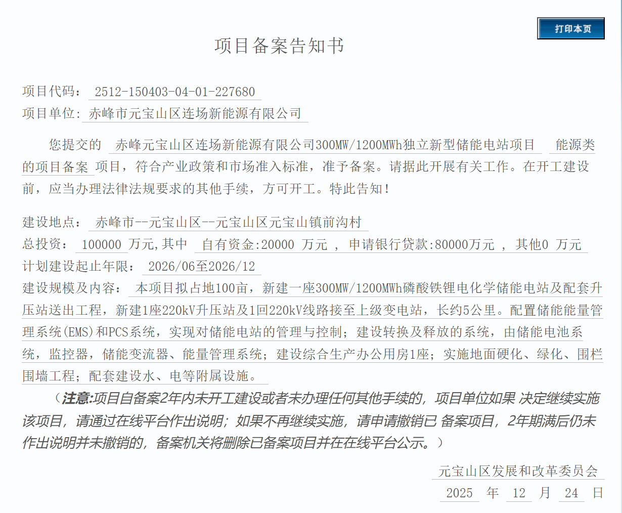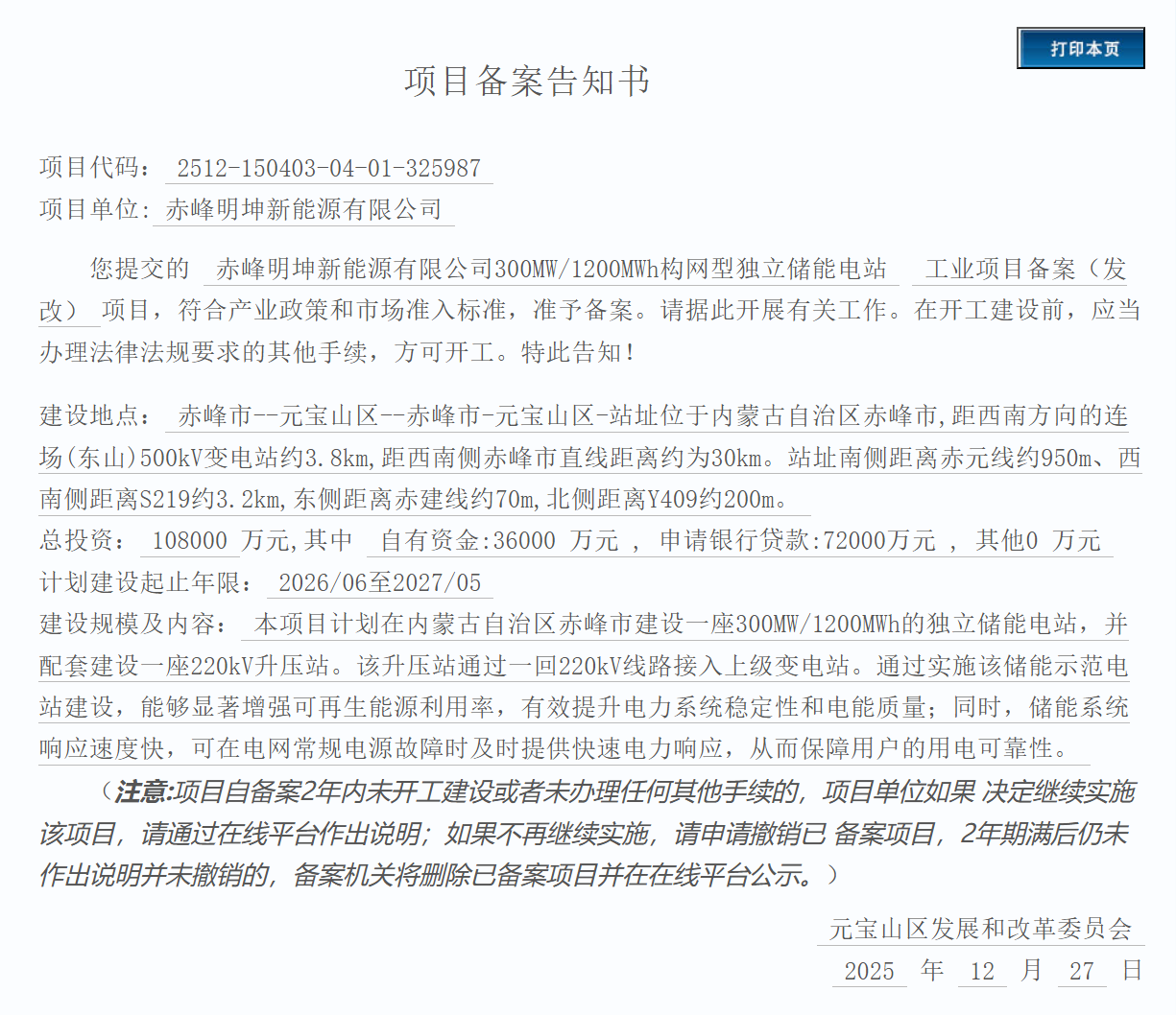 赤峰明坤新能源有限公司300MW/1200MWh構(gòu)網(wǎng)型獨立儲能電站