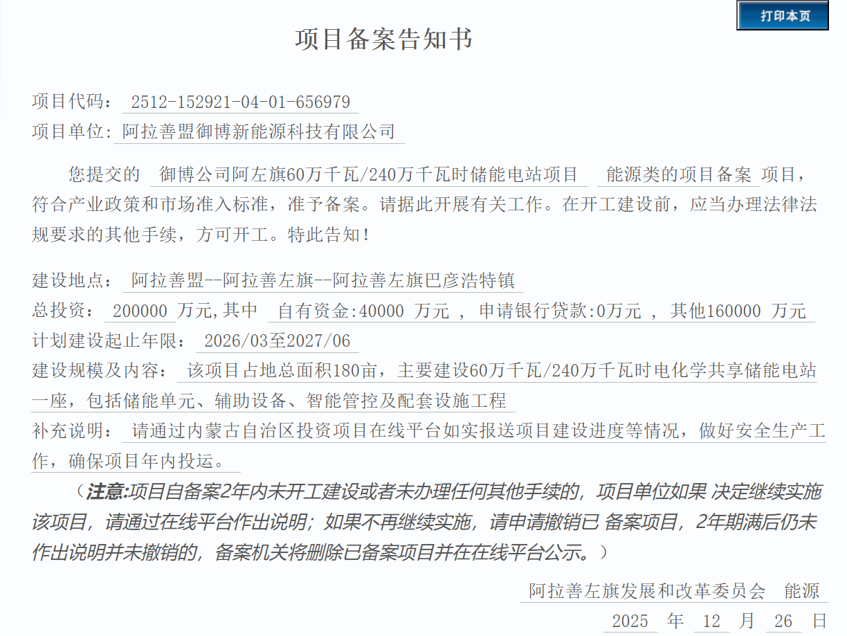 御博公司阿左旗60萬千瓦/240萬千瓦時儲能電站項目