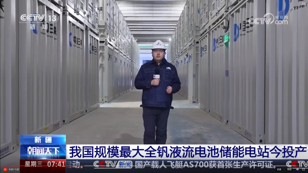 這里是新疆昌吉州吉木薩爾縣,大家看到的這一組組全帆液流電池的儲(chǔ)能單元,單組儲(chǔ)電容量超過(guò)了4000千瓦時(shí)。240組就構(gòu)成了我國(guó)目前規(guī)模最大的全釩液流電池儲(chǔ)能電站,它相當(dāng)于給光伏發(fā)電定制的巨型充電寶。