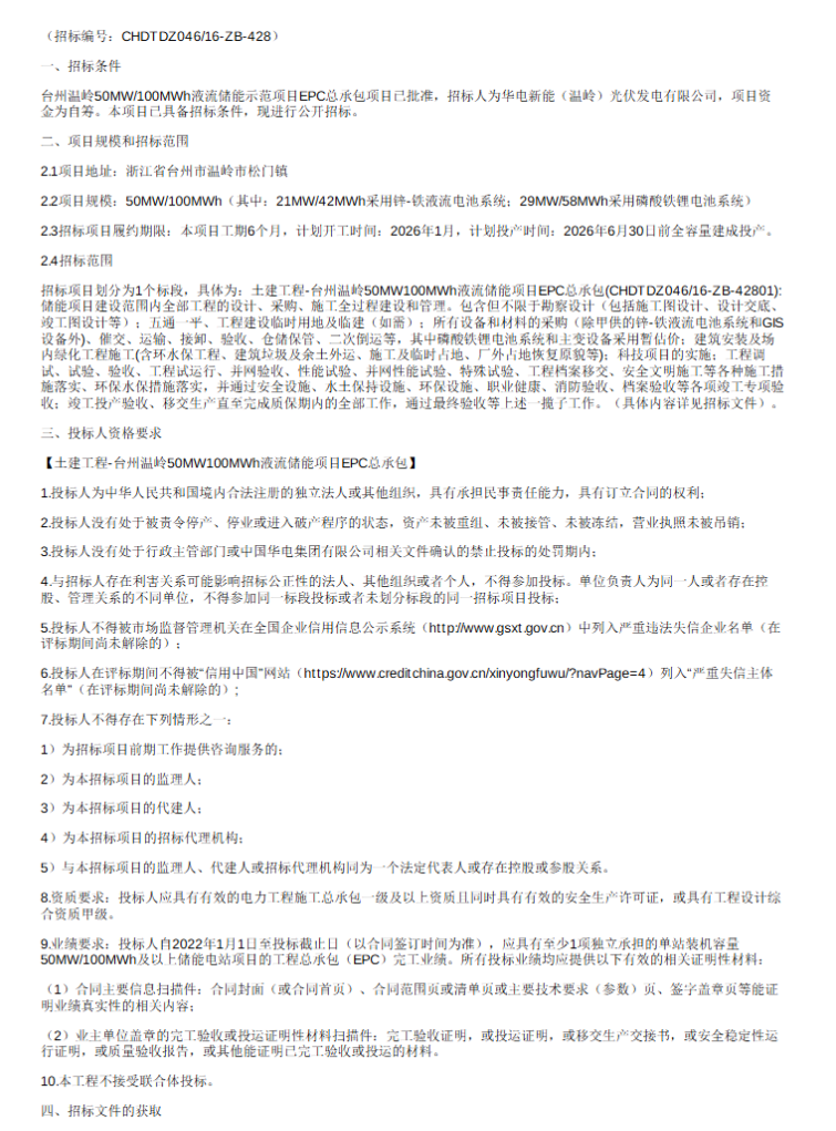 招標(biāo)范圍:招標(biāo)項(xiàng)目劃分為1個(gè)標(biāo)段,具體為:土建工程-臺(tái)州溫嶺5OMW10OMWh液流儲(chǔ)能項(xiàng)目EPC總承包(CHDTDZ046/16-ZB-42801):儲(chǔ)能項(xiàng)目建設(shè)范圍內(nèi)全部工程的設(shè)計(jì)、采購、施工全過程建設(shè)和管理。包含但不限于勘察設(shè)計(jì)(包括施工圖設(shè)計(jì)、設(shè)計(jì)交底、竣工圖設(shè)計(jì)等);五通一平、工程建設(shè)臨時(shí)用地及臨建(如需);所有設(shè)備和材料的采購(除甲供的鋅-鐵液流電池系統(tǒng)和G1S設(shè)備外)、催交、運(yùn)輸、接卸、驗(yàn)收、倉儲(chǔ)保管、二次倒運(yùn)等,其中磷酸鐵鋰電池系統(tǒng)和主變設(shè)備采用暫估價(jià);建筑安裝及場內(nèi)綠化工程施工(含環(huán)水保工程、建筑垃圾及余土外運(yùn)、施工及臨時(shí)占地、廠外占地恢復(fù)原貌等):科技項(xiàng)目的實(shí)施;工程調(diào)試、試驗(yàn)、驗(yàn)收、工程試運(yùn)行、并網(wǎng)驗(yàn)收、性能試驗(yàn)、并網(wǎng)性能試驗(yàn)、特殊試驗(yàn)、工程檔案移交、安全文明施工等各種施工措施落實(shí)、環(huán)保水保措施落實(shí),并通過安全設(shè)施、水土保持設(shè)施、環(huán)保設(shè)施、職業(yè)健康、消防驗(yàn)收、檔案驗(yàn)收等各項(xiàng)竣工專項(xiàng)驗(yàn)收;竣工投產(chǎn)驗(yàn)收、移交生產(chǎn)直至完成質(zhì)保期內(nèi)的全部工作,通過最終驗(yàn)收等上述一攬子工作。(具體內(nèi)容詳見招標(biāo)文件)。