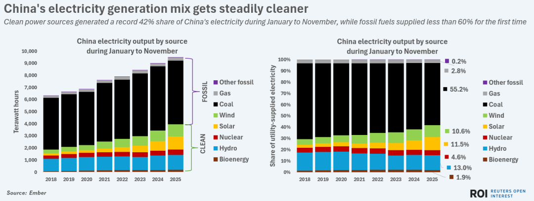 中國繼續(xù)領(lǐng)跑全球清潔能源發(fā)電,其核能、太陽能、風(fēng)能和生物能發(fā)電量均居世界各國之首。根據(jù)Ember數(shù)據(jù),2025年前11個(gè)月,全國清潔電力產(chǎn)量同比增長15.4%,有望迎來連續(xù)第七年的強(qiáng)勁增長。在1月至11月期間,清潔電力在中國總發(fā)電量中的占比創(chuàng)下42%的新高,而化石燃料的占比首次降至不足60%。這是歷史上首次,清潔電力將占中國公用事業(yè)發(fā)電量的40%以上,而化石燃料的份額則跌至新低。