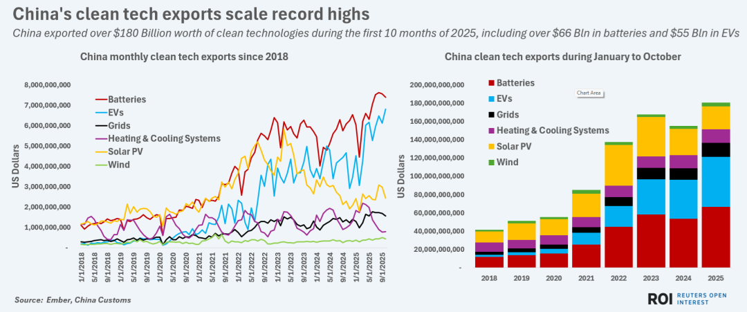 2025年前10個(gè)月,中國清潔技術(shù)出口總額超過1800億美元,其中包括逾660億美元的電池和約550億美元的電動(dòng)車。電網(wǎng)設(shè)備、供暖與制冷設(shè)備的出口也在2025年創(chuàng)下新高,進(jìn)一步鞏固了中國作為全球電氣化硬件主要供應(yīng)國的地位。