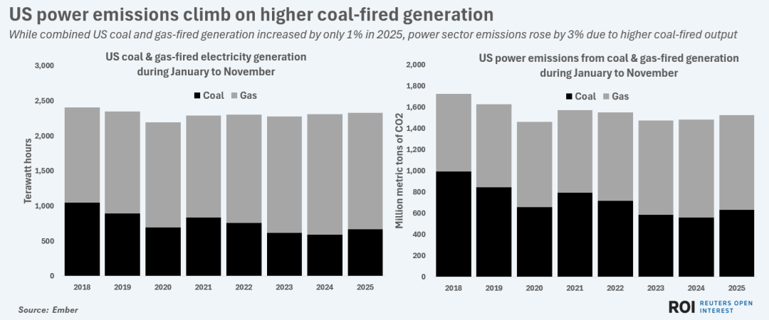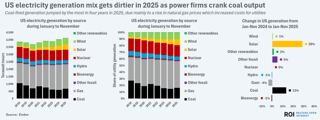 天然氣仍是美國最主要的電力來源,但在2025年,燃煤電廠發(fā)電量增幅最大,主要原因是天然氣價(jià)格飆升壓縮了公用事業(yè)利潤空間。由于天然氣價(jià)格上漲,2025年美國燃煤發(fā)電量創(chuàng)四年最大增幅,推高了公用事業(yè)成本。根據(jù)Ember數(shù)據(jù),2025年1月至11月,燃煤發(fā)電量同比增長13%,為三年來最高水平。由于燃煤電廠每兆瓦時(shí)排放二氧化碳超過90萬噸,遠(yuǎn)高于燃?xì)怆姀S的約55萬噸,因此美國電力行業(yè)的碳排放量在2025年也隨之上升。