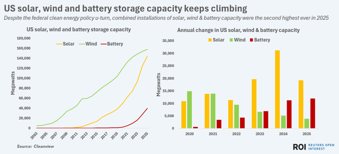 盡管2025年美國公用事業(yè)公司增加了燃煤發(fā)電,但它們也部署了創(chuàng)紀(jì)錄的電池儲(chǔ)能容量,以儲(chǔ)存多余的太陽能和風(fēng)能供后續(xù)使用。根據(jù)能源數(shù)據(jù)平臺(tái)Cleanview的數(shù)據(jù),2025年美國已安裝的電池儲(chǔ)能容量超過39吉瓦,較2024年增長43%。