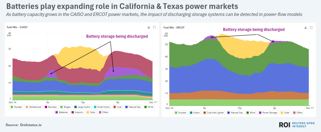 加州獨(dú)立系統(tǒng)運(yùn)營商(CAISO)——該州主要電網(wǎng)及全美最大的電池應(yīng)用方——在晚間高峰用電時(shí)段,電池供電比例已達(dá)15%至18%,減少了對(duì)天然氣等電源的依賴。在得克薩斯電力可靠性委員會(huì)(ERCOT)——一個(gè)較晚采用電池系統(tǒng)的地區(qū)——高峰負(fù)荷期間的電池供電比例約為3%,雖不算高,但相比一年前的接近零已有顯著提升。
