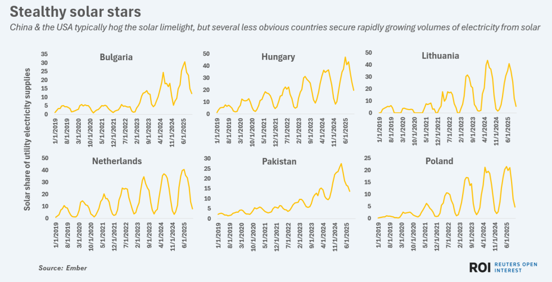 2025年某些時(shí)段,保加利亞、巴基斯坦、匈牙利和波蘭等國約20%或更多的電力來自太陽能發(fā)電場(chǎng),既降低了成本又減少了排放。盡管中美通常主導(dǎo)太陽能話題,但多個(gè)“低調(diào)”國家正迅速提高來自太陽能的電力供應(yīng)比例。進(jìn)入2026年,預(yù)計(jì)更多國家將刷新太陽能發(fā)電占比紀(jì)錄,即使像美國這樣的主要經(jīng)濟(jì)體出現(xiàn)倒退,也有助于維持全球能源轉(zhuǎn)型的動(dòng)力。