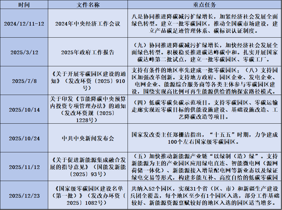 “十四五”以來,國家對零碳園區(qū)的支持力度顯著增強,政策體系日趨完善。2025年政府工作報告首次將“建立一批零碳園區(qū)”納入年度重點工作,標志著零碳園區(qū)建設從行業(yè)探索上升至綠色轉型的重點任務;2025年6月,“910號文”明確加快園區(qū)用能結構轉型、大力推進園區(qū)節(jié)能降碳等八大重點任務,為園區(qū)建設提供了清晰的“行動指南”。