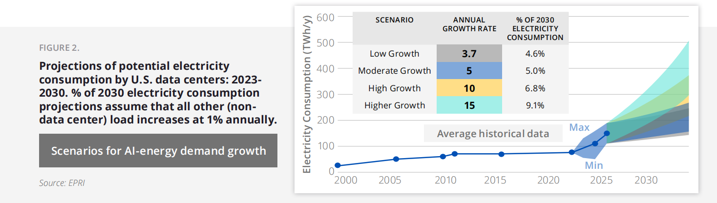 國(guó)際能源署于2024年7月更新了其為期兩年的全球能源使用預(yù)測(cè),納入了數(shù)據(jù)中心和人工智能驅(qū)動(dòng)的電力消耗預(yù)測(cè)。3 國(guó)際能源署估計(jì),這些數(shù)字技術(shù)總體上在2022年占全球電力需求的近2%——到2026年這一數(shù)字可能翻倍,相當(dāng)于日本這樣規(guī)模國(guó)家的用電量。4
