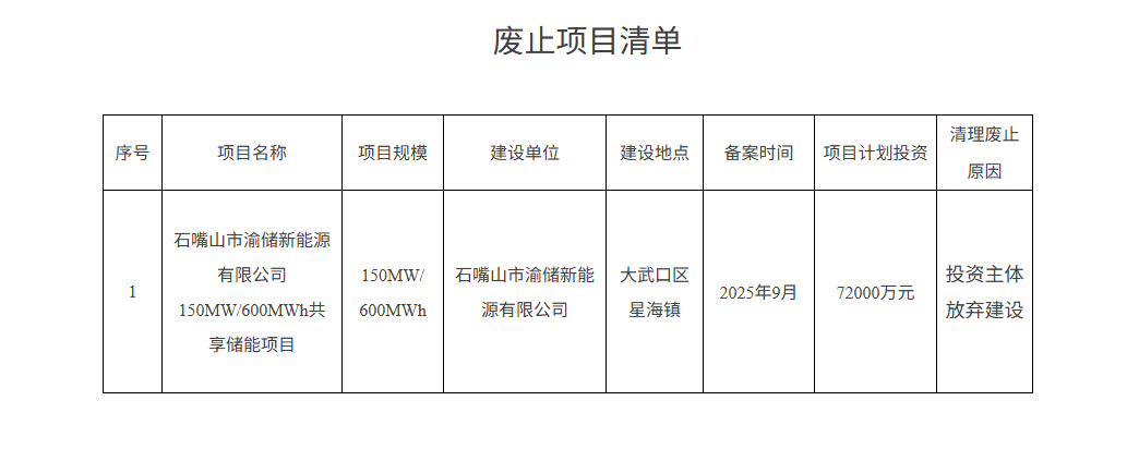為推動我區(qū)新能源產(chǎn)業(yè)高質(zhì)量發(fā)展,促進資源節(jié)約集約利用,按照《自治區(qū)發(fā)展改革委關(guān)于促進儲能健康發(fā)展的通知》(寧發(fā)改能源(發(fā)展)〔2024〕816號)精神,經(jīng)摸排梳理備案新型儲能項目,石嘴山市渝儲新能源有限公司150MW/600MWh共享儲能項目因無法滿足項目并網(wǎng)接入的技術(shù)要求,項目實施條件暫不具備,現(xiàn)予以廢止。有關(guān)項目情況公告如下: