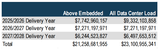 下表顯示了在2025/2026年度BRA、2026/2027年度BRA和2027/2028年度BRA中,數(shù)據(jù)中心需求導(dǎo)致的其他PJM客戶成本的增加。在2027/2028年度BRA中,由于數(shù)據(jù)中心需求導(dǎo)致的其他PJM客戶成本增加為6,497,653,512美元。在過去三次BRA中,由于數(shù)據(jù)中心負(fù)荷導(dǎo)致的其他PJM客戶總成本增加為23,100,955,341美元。