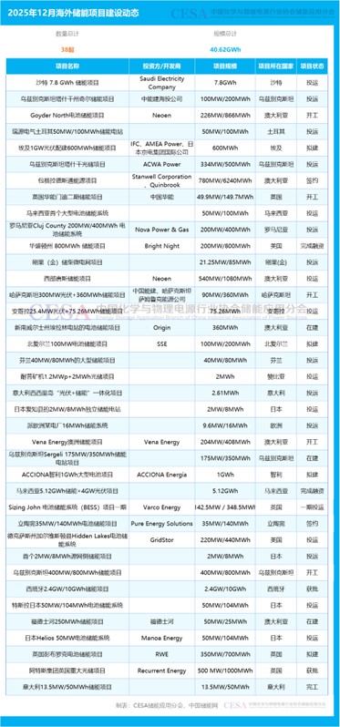 中國(guó)儲(chǔ)能網(wǎng)訊:2025年12月,CESA儲(chǔ)能應(yīng)用分會(huì)產(chǎn)業(yè)數(shù)據(jù)庫(kù)追蹤到38起海外儲(chǔ)能項(xiàng)目建設(shè)動(dòng)態(tài)事件,總規(guī)模為40.62GWh,涉及Saudi Electricity Company、中能建海投公司、Neoen、IFC、AMEA Power、日本京電集團(tuán)國(guó)際公司、ACWA Power、Stanwell Corporation、Quinbrook Infrastructure Partners、中國(guó)華能、Nova Power & Gas、Bright Night等全球能源投資方/開(kāi)發(fā)商,建設(shè)地點(diǎn)位于西班牙、澳大利亞、沙特、馬來(lái)西亞、英國(guó)、烏茲別克斯坦、美國(guó)、智利等全球20多個(gè)國(guó)家。