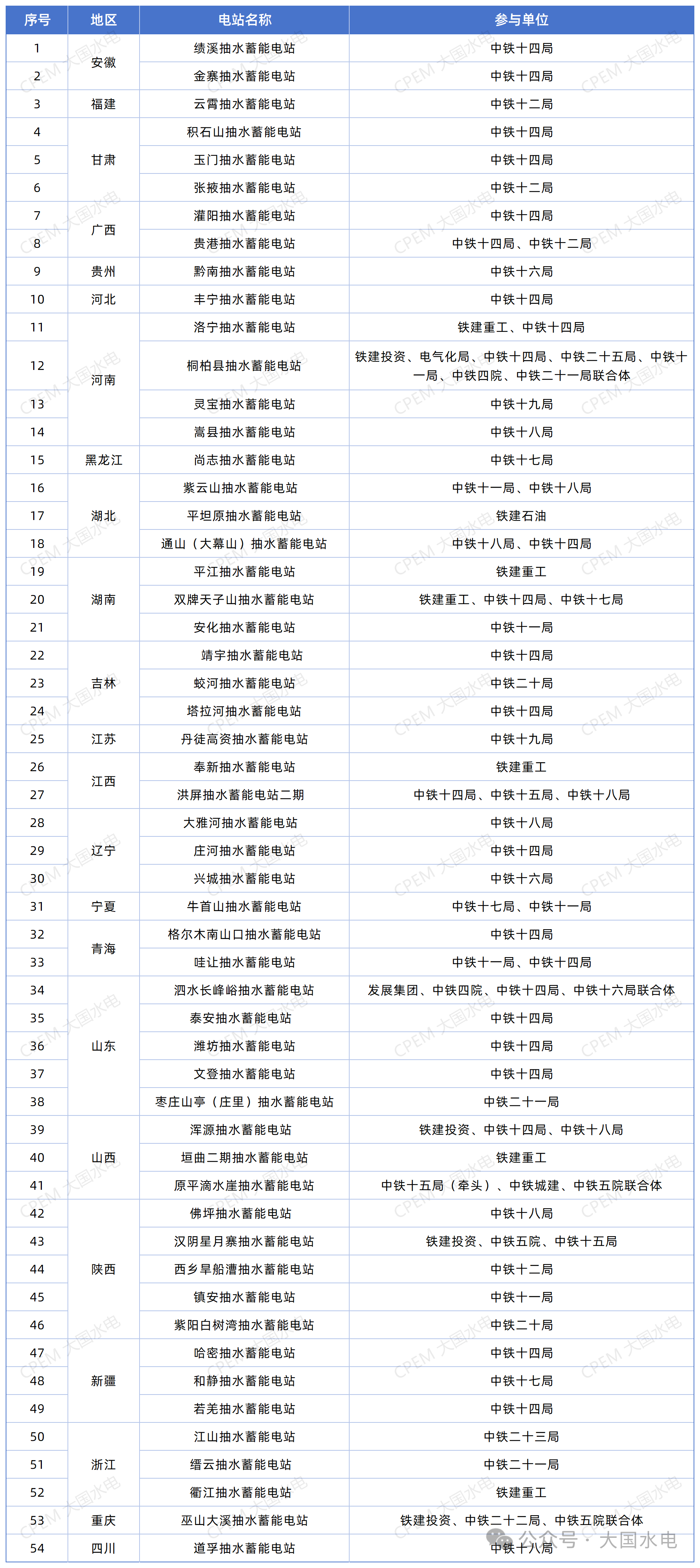 2023年后,中國鐵建在抽水蓄能領域進入快速發(fā)展期,參與多個國家級重點工程。據(jù)CPEM大國水電不完全統(tǒng)計,中國鐵建參與的抽水蓄能項目遍布了全國20多個省份,總計約54個,如下: