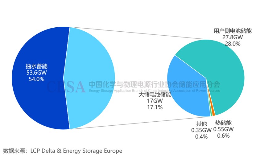據(jù)LCP Delta 和 Energy Storage Europe(前身為歐洲儲能協(xié)會,EASE)最新數(shù)據(jù)顯示,截至2025年11月1日,歐洲儲能累計(jì)裝機(jī)已達(dá)到99.3GW。其中,電池儲能系統(tǒng)(主要是鋰離子電池)累計(jì)裝機(jī)高達(dá)44.8GW,占比高達(dá)45.1%,作為主要增長點(diǎn),到2026年下半年,歐洲電池儲能累計(jì)裝機(jī)將超過抽水蓄能。