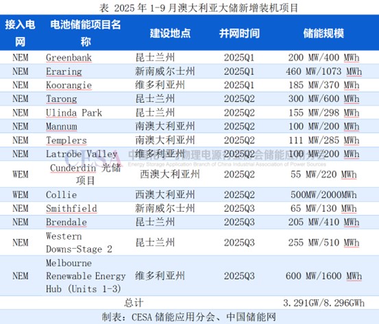 澳大利亞能源市場運(yùn)營商(AEMO)和CESA儲能應(yīng)用分會數(shù)據(jù)顯示,2025年前三季度,澳大利亞新增裝機(jī)14個大儲項(xiàng)目,大儲新增裝機(jī)規(guī)模3.291GW/8.296GWh,超過往年的總和。截至2025年9月底,澳大利亞電池大儲累計(jì)裝機(jī)達(dá)6.3GW/13.1GWh。