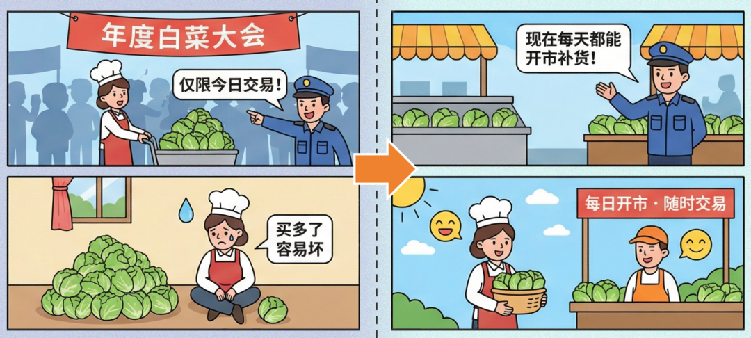 在此之前,電力中長(zhǎng)期交易側(cè)重于年度和月度交易,交易安排更像是菜市場(chǎng)里的“定期趕大集”。一年只在年初集中開(kāi)一次年度大集,月度交易也往往僅限于每月初固定開(kāi)市,飯店和菜販必須在年度和月度大集上把未來(lái)的白菜買賣談妥。如果飯店在兩次“大集”之間需要調(diào)整進(jìn)貨計(jì)劃,通常缺乏靈活補(bǔ)單的渠道,只能轉(zhuǎn)向當(dāng)天市場(chǎng)采購(gòu),被動(dòng)承擔(dān)更大的價(jià)格波動(dòng)風(fēng)險(xiǎn)。