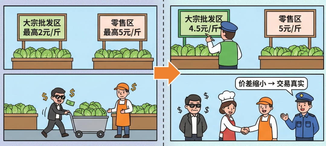 現(xiàn)在,市場(chǎng)管理者認(rèn)識(shí)到這一問(wèn)題,并推出新規(guī):“將逐步調(diào)整批發(fā)區(qū),特別是月內(nèi)批發(fā)的最高限價(jià),向零售區(qū)的最高限價(jià)靠攏”。例如,將原本2元/斤的批發(fā)限價(jià)逐步提高至4.5元/斤,這意味著,兩個(gè)交易區(qū)域的價(jià)格“天花板”將逐漸對(duì)齊。當(dāng)價(jià)差被縮小后,白菜批發(fā)合同的性質(zhì)也隨之發(fā)生變化,開(kāi)始真正承擔(dān)起提前發(fā)現(xiàn)價(jià)格、穩(wěn)定預(yù)期的功能。菜販看到批發(fā)價(jià)與零售價(jià)銜接順暢,敢提前規(guī)劃明年種多少白菜;飯店看到長(zhǎng)期價(jià)格不再與當(dāng)天價(jià)格嚴(yán)重脫節(jié),也更愿意提前鎖定采購(gòu)量。最終,白菜價(jià)格既穩(wěn)得住,又調(diào)得動(dòng),整個(gè)菜市場(chǎng)運(yùn)行得更順暢。