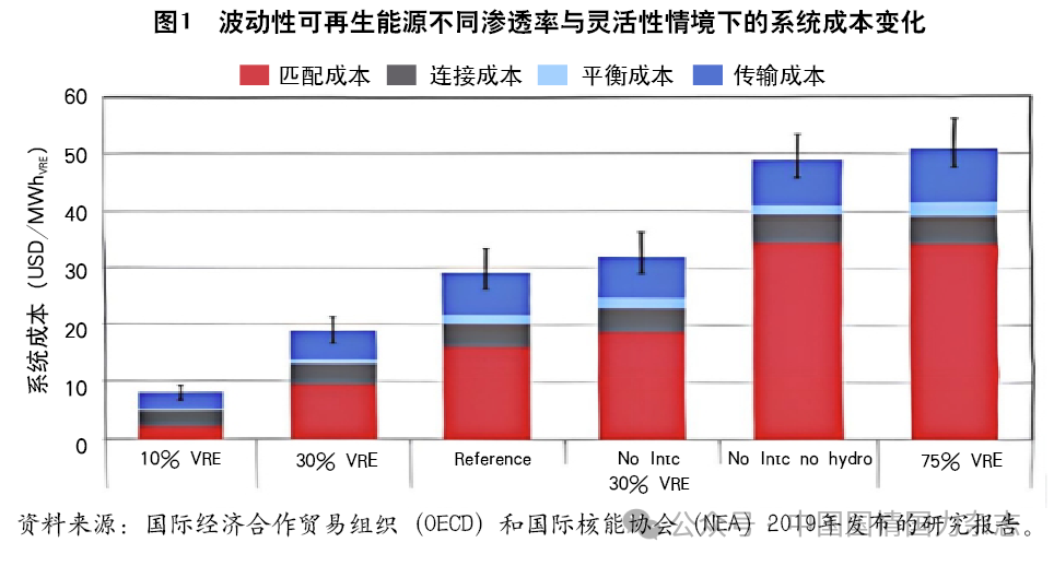 該研究發(fā)現(xiàn),電網(wǎng)整合VRE的系統(tǒng)成本與VRE的滲透率呈現(xiàn)明顯正向關(guān)系。具體來看,當(dāng)波動性可再生能源在電力系統(tǒng)滲透率為10%時,其所研究的案例系統(tǒng)成本為7美元/MWh(相當(dāng)于人民幣每4.76分/kWh);當(dāng)滲透率提高到30%,系統(tǒng)成本相當(dāng)于10%滲透率時的2.5倍;滲透率達(dá)到50%時系統(tǒng)成本相當(dāng)于10%滲透率時的4.3倍。當(dāng)然上述系統(tǒng)成本的具體數(shù)值及變化取決于所研究的電力系統(tǒng)的“靈活性”程度?,F(xiàn)有電力系統(tǒng)越靈活,則波動性可再生能源滲透率提升所增加的系統(tǒng)成本就越少。如圖1所示,同樣是50%滲透率條件下,既無互聯(lián)線路(intc),也無水電(hydro),即靈活性資源更少的情形與僅沒有互聯(lián)線路的情形相比,匹配成本大幅上升[2]。