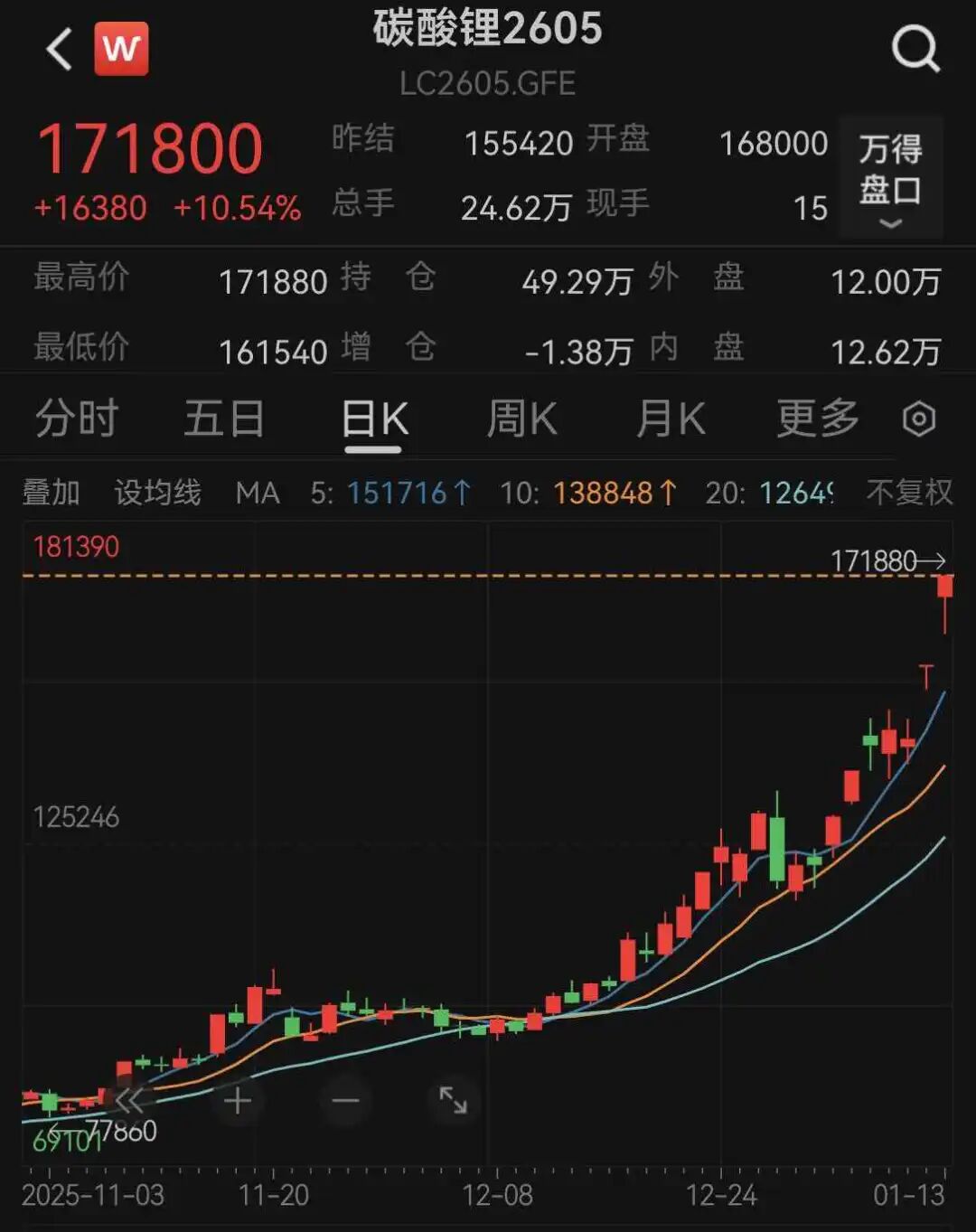 截至發(fā)稿,漲幅超10%,報(bào)171800元/噸。