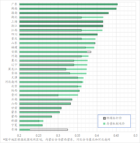對于存量項目機制電價,各地普遍對標當?shù)厝济夯鶞蕛r,保障平穩(wěn)過渡。存量項目機制電價整體處于0.26-0.45元/千瓦時之間,平均值為0.364元/千瓦時(各省存量項目機制電價與燃煤基準價見圖1)。東部沿海地區(qū)、珠三角地區(qū)和中部部分地區(qū)的價格水平普遍較高,處于0.38-0.45元/千瓦時之間,其中湖南、廣東最高,分別為0.45、0.453元/千瓦時。而資源較好但用電需求較低的西北區(qū)域機制電價水平明顯低于其他地區(qū),處在0.22-0.30元/千瓦時之間。全國12地的存量項目機制電價高于當?shù)厝济夯鶞蕛r,其中貴州價差最大達+17.2%;僅安徽、青海兩地存量項目機制電價低于當?shù)厝济夯鶞蕛r,青海0.227元/千瓦時的價格水平不僅為全國最低,低于燃煤基準價30.1%的價差也是全國首位。