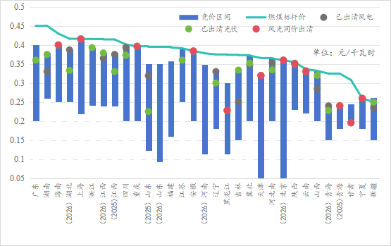 對于增量項目機制電價,25地電價整體呈現(xiàn)“東高西低、中部均衡”的三檔格局。第一檔是東部高電價區(qū)(0.36-0.4元/千瓦時),以上海、江蘇、浙江、廣東為代表。第二檔是中部均衡區(qū)(0.32-0.38元/千瓦時),涵蓋山西、江西、湖南、重慶等地。第三檔是西部低電價區(qū)(0.195-0.26元/千瓦時),包括甘肅、寧夏、新疆等西北省區(qū)。第一檔全國最高價的上海和第三檔全國最低價的甘肅價差超0.3元/千瓦時。風、光出清價格不同的地區(qū)有11個,價差最大的是山東,僅湖南、冀北兩地光伏出清價格高于風電。從競價區(qū)間與燃煤標桿電價維度來看,有14個地區(qū)競價上限較燃煤標桿電價下降,平均降幅約11%。從競價區(qū)間與最終出清價格的維度來看,僅甘肅按競價下限出清,其他多數(shù)地區(qū)出清價格位于競價區(qū)間的中偏上區(qū)間,競價上限較高的區(qū)域出清價格也較高。