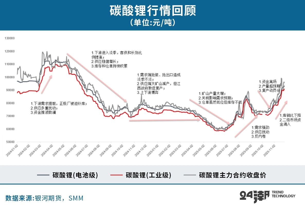 進入下半年,部分地區(qū)礦權(quán)變更問題一度引發(fā)鋰價大漲,江西8宗涉鋰資源礦權(quán)存在越權(quán)辦理相關(guān)登記手續(xù)問題,青海格爾木藏格鉀肥有限公司被責(zé)令停止違規(guī)鋰資源開發(fā)活動并整改。這類政策監(jiān)管舉措,短期內(nèi)收縮了碳酸鋰上游原料的供給規(guī)模,尤其7月下旬江西八大礦山礦證變更事件引發(fā)市場對于停產(chǎn)的擔(dān)憂,疊加“寧德時代宜春礦停產(chǎn)”事件引發(fā)供應(yīng)緊張預(yù)期,此外儲能訂單超預(yù)期爆發(fā)進一步擾動市場情緒,國內(nèi)多地出臺儲能容量電價政策,市場化招投標(biāo)活躍;海外則因電力成本高企及政策支持,儲能需求呈現(xiàn)爆發(fā)態(tài)勢,形成國內(nèi)外市場共振,帶動碳酸鋰價格上漲。11月碳酸鋰主力合約沖高至10.25萬元/噸,年末收官于12 萬元/噸附近。