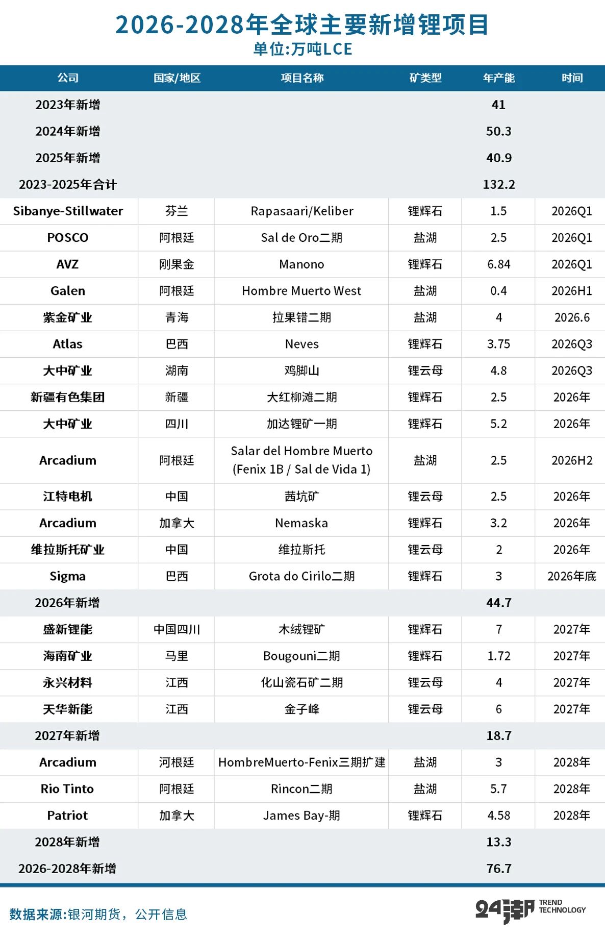 據(jù)筆者統(tǒng)計,2023-2025年全球鋰資源新增投項目產(chǎn)能合計132.2萬噸,主要來自國內(nèi)鹽湖新項目以及鋰輝石投產(chǎn)、非洲礦,以及南美鹽湖產(chǎn)能的爬產(chǎn)等。