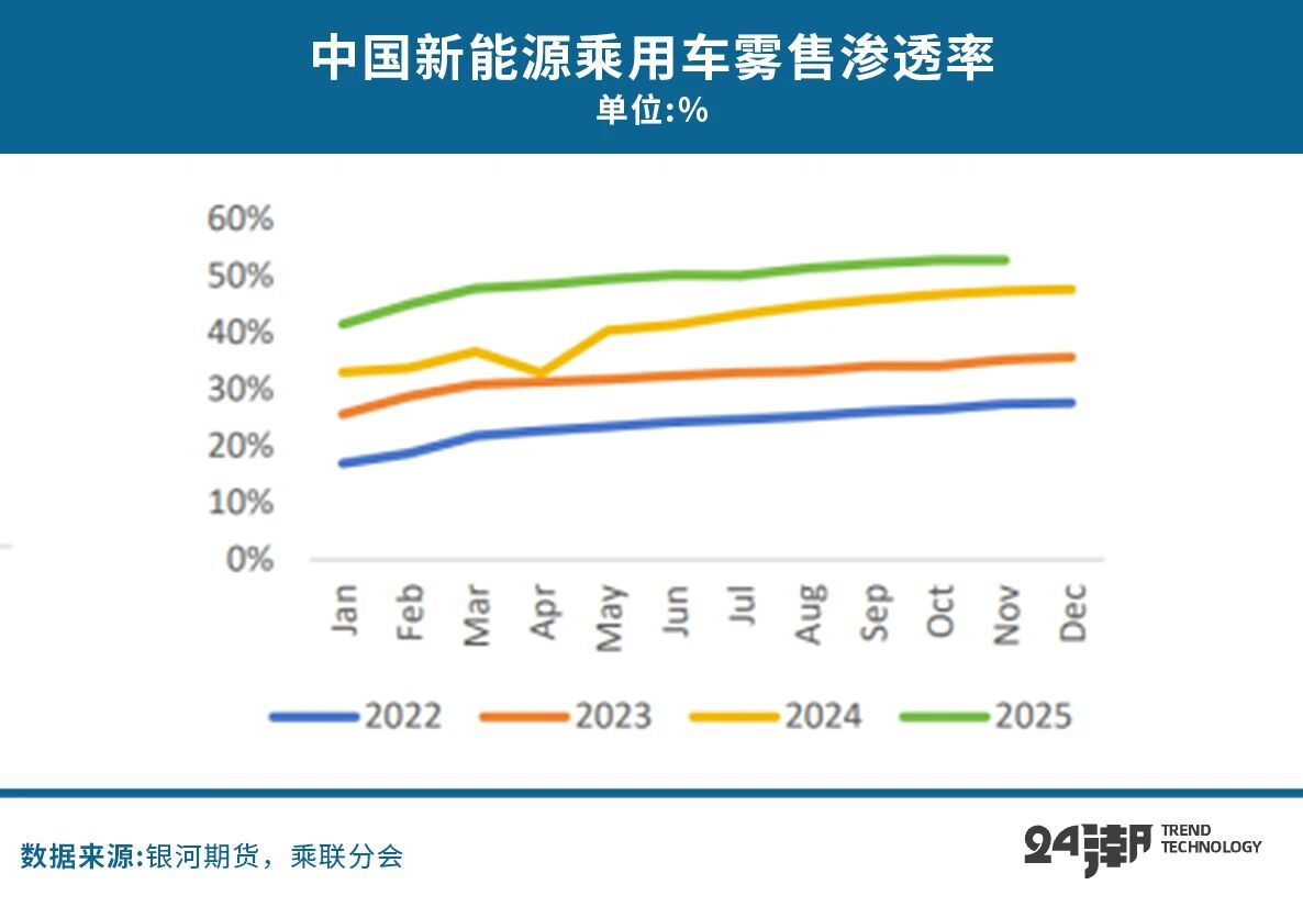 中汽協(xié)數(shù)據(jù)統(tǒng)計,2025年1-11月中國新能源汽車銷量累計同比增長31%至1473.4萬輛,11月滲透率達到53%。預(yù)計全年有望達到1655萬輛,累計同比增長29%,全年滲透率有望達到48%。在當(dāng)前新能源乘用車零售滲透率已超過60%的前提下,補貼若不加碼,車銷增速出現(xiàn)下滑已是大概率事情。