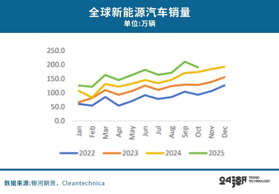 根據(jù)銀河期貨的預(yù)計,2026 年全球新能源乘用車銷量增長14%至2410萬輛,增速放緩。