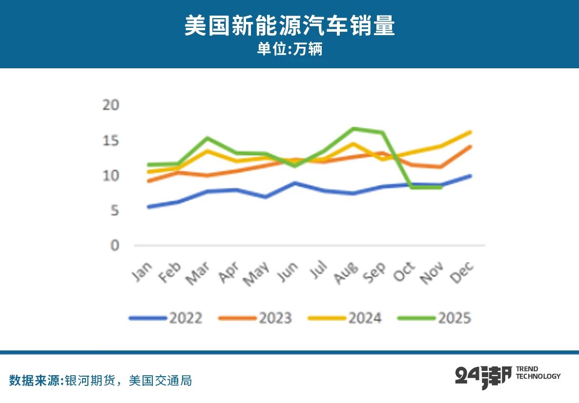 再看美國市場, 2025年7月4日,特朗普簽署"大而美"法案,對《通脹削減法案》所確立的新能源激勵機制作出重要調(diào)整,原對于新能源汽車的稅收抵免政策于2025年9月30日提前終止,該政策出臺后,3季度美國新能源汽車出現(xiàn)搶購潮,并于10月銷量出現(xiàn)斷崖式下降。2025年1-10月美國新能源汽車銷量139萬輛,同比增長6%,預(yù)計2026年美國新能源汽車銷量155萬輛,同比下滑3%。
