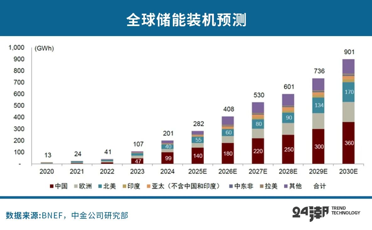 根據(jù)中金的保守估計2025/2026年國內(nèi)儲能裝機量將達到140GWh/180GWh、同比增速41%、29%,全球裝機282GWh/408GWh、同比增長41%/45%。