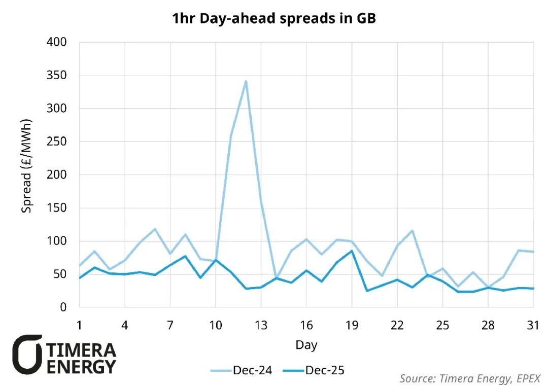 缺乏"風(fēng)力沉寂期"引發(fā)的波動:2024年12月,一次明顯的"風(fēng)力沉寂期"(低風(fēng)力與高需求同時發(fā)生)導(dǎo)致系統(tǒng)收緊,顯著提高了價格波動性,日前價差達到約340英鎊/兆瓦時。而2025年12月的特點是冬季更為溫和,持續(xù)低風(fēng)期較少,限制了波動性并壓低了價差,從而減少了電池儲能的套利空間。