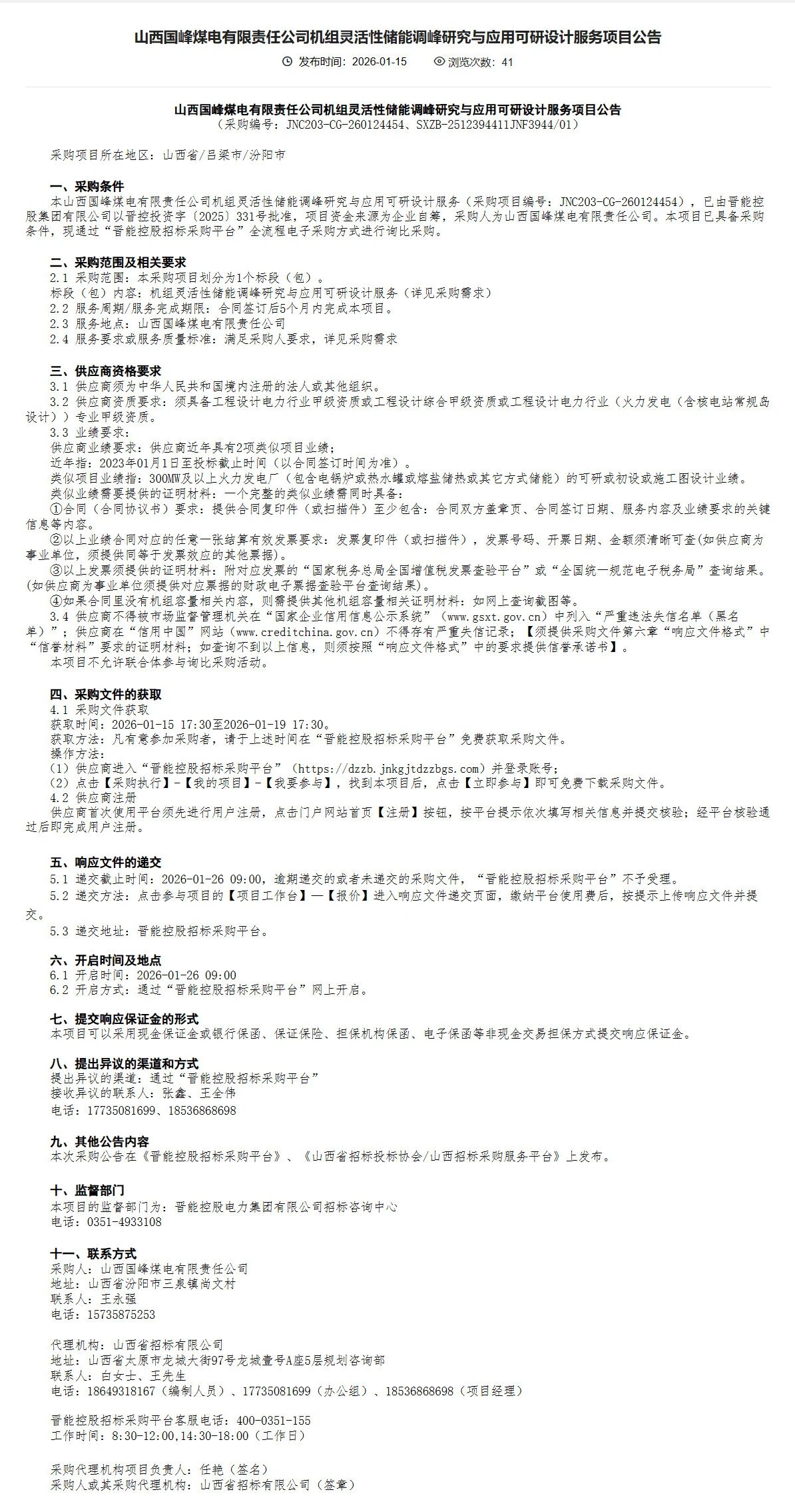 中國儲能網(wǎng)訊:1月15日,晉能控股集團下屬的國有火力發(fā)電企業(yè)山西國峰煤電有限責任公司就其機組靈活性儲能調峰研究與應用可研設計服務項目發(fā)布采購公告。