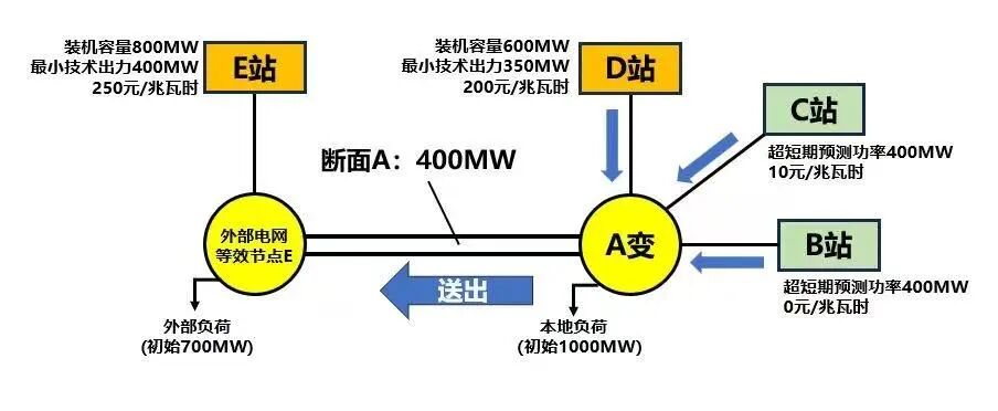 報量報價風(fēng)電場B站、C站與燃煤電廠D站同處在重要斷面A(容量400兆瓦)送端,三者靈敏度均為1(即其上述任一場站出力變化1兆瓦,斷面潮流同步變化1兆瓦),E為外部電網(wǎng)等效節(jié)點,如圖1所示。其中B站超短期預(yù)測功率為400兆瓦,報價0元/兆瓦時;C站超短期預(yù)測功率為400兆瓦,報價10元/兆瓦時;D站裝機(jī)容量600兆瓦,最小技術(shù)出力350兆瓦,報價200元/兆瓦時;E站裝機(jī)容量800兆瓦,最小技術(shù)出力400兆瓦,報價250元/兆瓦時;實時市場新能源保障執(zhí)行下限系數(shù)β為0.6。