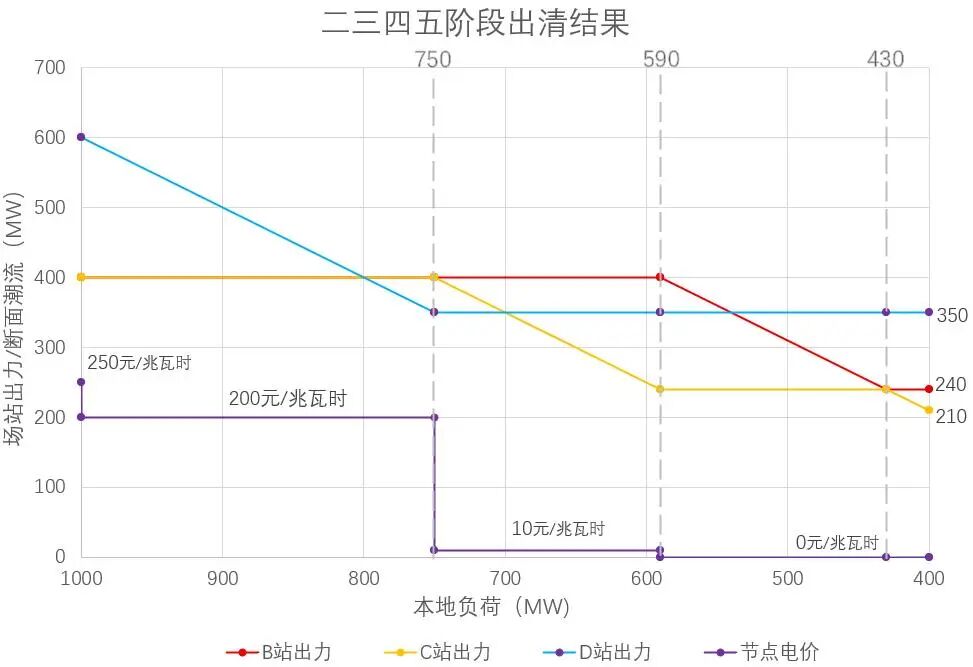 b)二三四五階段(本地負(fù)荷由1000兆瓦降至400兆瓦)出清結(jié)果
