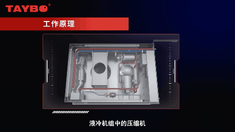 液冷機(jī)組中的壓縮機(jī)將制冷劑氣體壓縮成高溫高壓蒸汽,流到冷凝器中散熱,散熱風(fēng)扇采用高靜壓離心風(fēng)扇,通過(guò)布置在柜體壁面的散熱風(fēng)道,將熱量導(dǎo)到外界環(huán)境。冷卻后的制冷劑液體經(jīng)過(guò)節(jié)流降溫流入到板換吸熱,板換中的冷卻液降溫后,通過(guò)水泵輸送到電池包內(nèi)冷卻電芯,形成循環(huán)。
