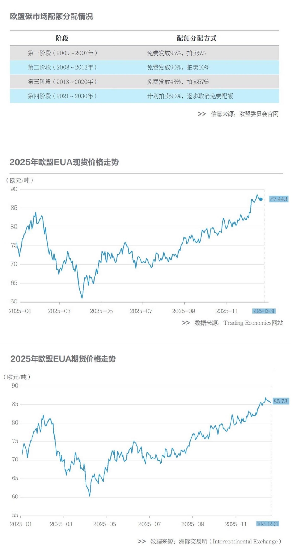 目前,市場(chǎng)上基本以歐盟碳排放權(quán)配額(EUA)的現(xiàn)貨或期貨價(jià)格來代表“歐盟碳價(jià)”。2025年,EUA現(xiàn)貨和期貨價(jià)格均呈現(xiàn)“第一季度先短暫上升后下降,4月見底,隨后震蕩上行并在年末明顯走強(qiáng)”的結(jié)構(gòu)性行情。